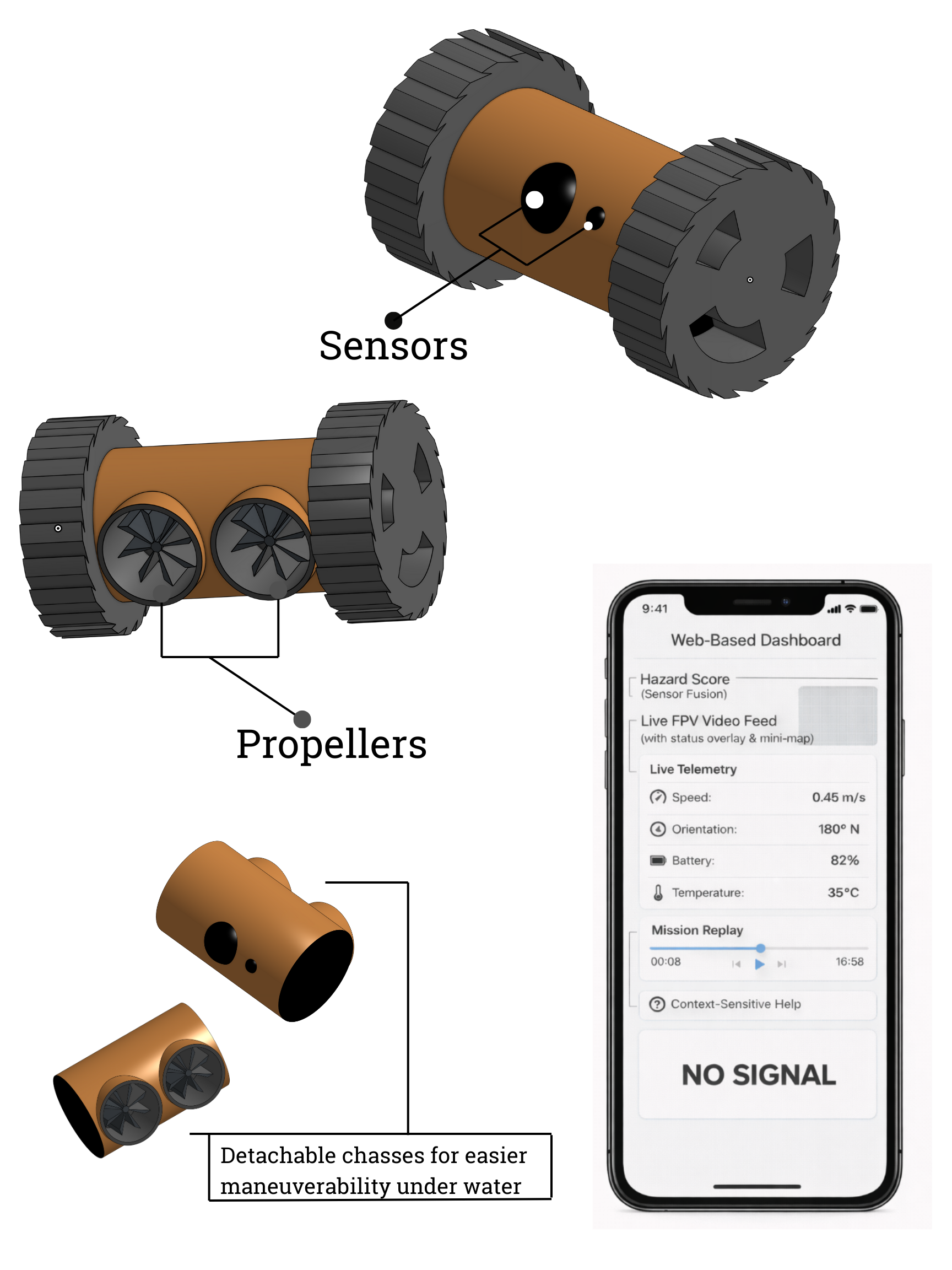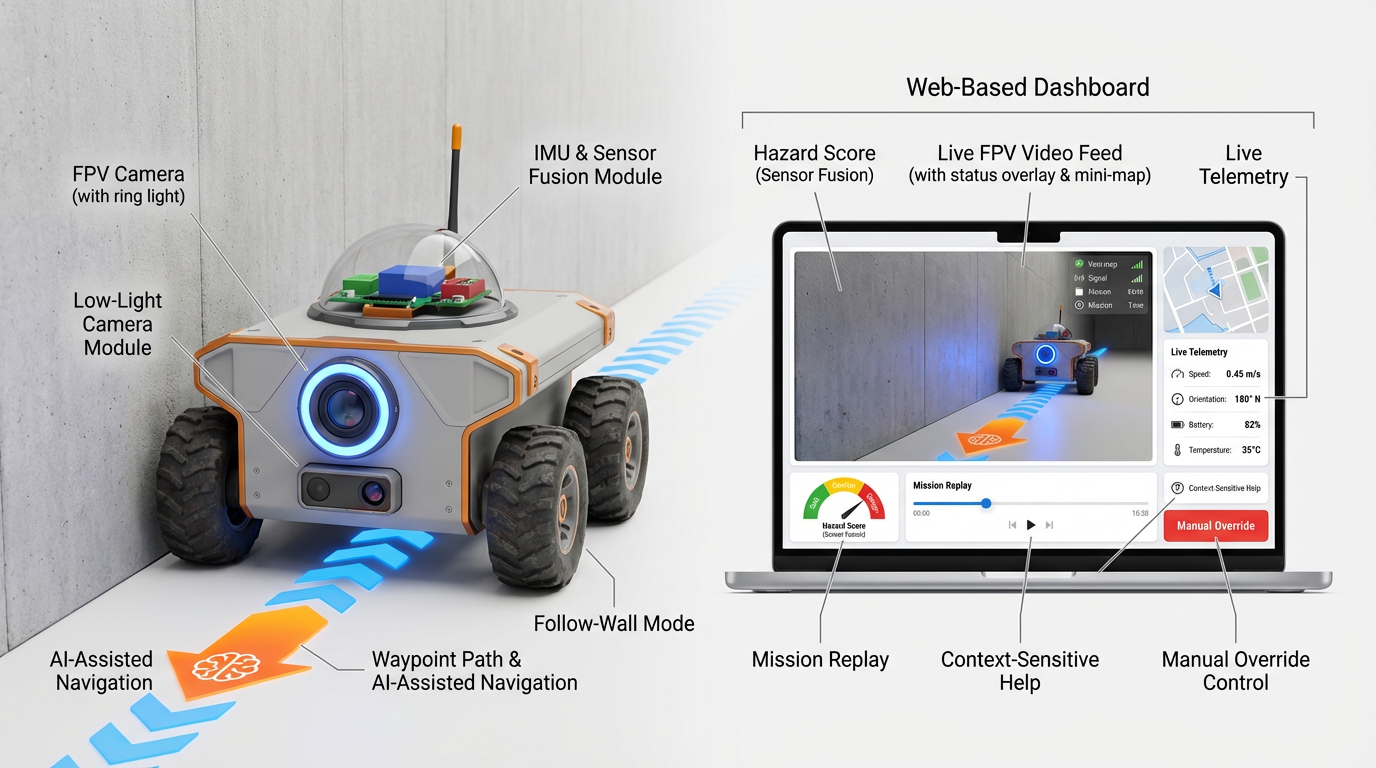 FPV video to a personal device and a live telemetry display keep the operator informed at a safe distance. The hazard scoring algorithm simplifies environmental risk into one easy-to-read indicator. On-screen prompts reduce confusion and training time. Thermal shutdown protects the system from overheating, and replaceable battery packs plus a replaceable outer shell reduce downtime and make field recovery practical.