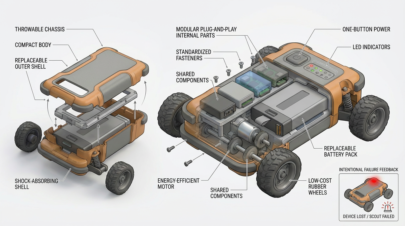 This concept is built for situations where the environment is dangerous and the robot might get damaged. The idea is to keep the robot simple, affordable, and easy to deploy, so a user can quickly send it into a risky area without worrying too much about losing it. It turns on with a single button, drives using basic wheels, and focuses on getting useful information fast. If something breaks, only the damaged parts need to be replaced instead of the whole robot, making it practical for repeated use in high-risk scenarios.